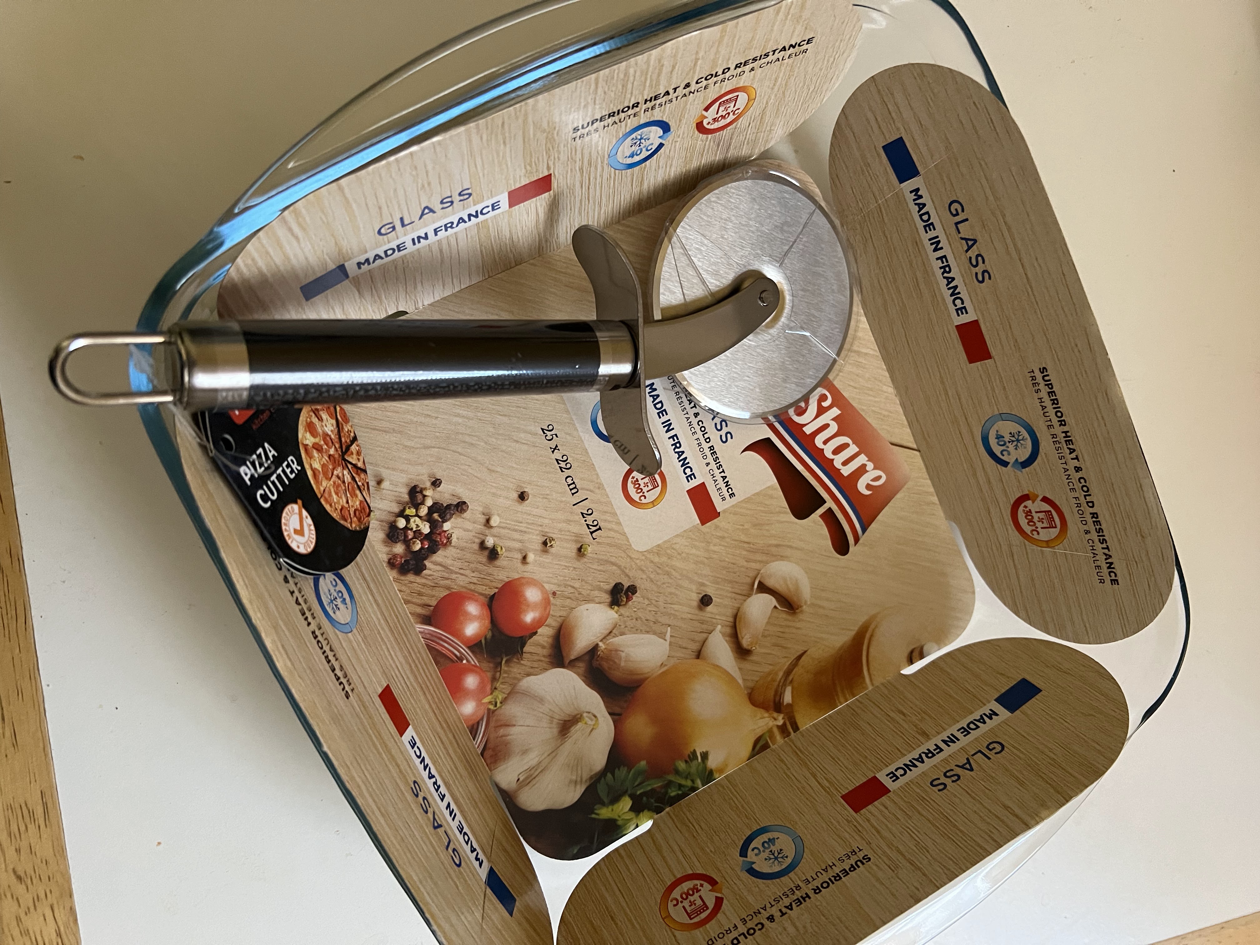 Je suis très contente j’ai trouvé ce que je voulais rapidement ! Des assiettes à pizza, une roulette pour les couper ainsi qu’un plat en verre pour pas cher !